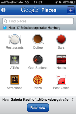 Android wurde bereits im vergangenen Herbst abgedeckt, nun ist also das iPhone dran. Google hat am Mittwochabend „Google Places“ im App Store veröffentlicht, in den deutschen App-Charts schoss die Anwendung binnen weniger Stunden auf Platz fünf. Und, ja: Die App ist englischsprachig – und, ja: sie hält nichts vom metrischen System und navigiert uns folglich in „Meilen“ zum nächsten Ort. Aber darum soll es nicht gehen…