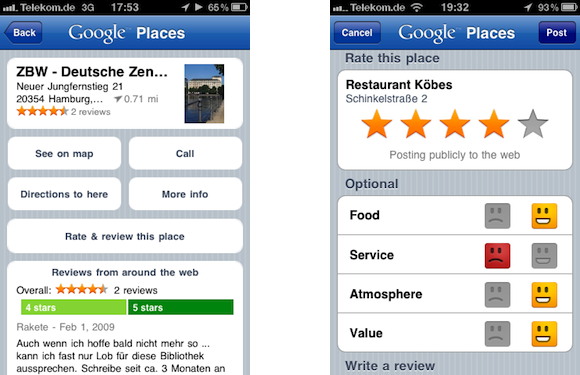 Doch Google Places ist in Version 1.0.1 – das darf nicht verschwiegen werden – alles andere als ein großer Wurf. Die App wirkt spröde, beinahe statisch: Neun Buttons zieren den Start-Screen, auf dem Google für die Nutzer eine Vorauswahl an diversen Location-Arten getroffen hat (etwa Restaurants, Bars, Bankautomaten, Tankstellen oder… ja: Pizzerien). Unabhängig von den vordefinierten Kategorien können Nutzer per einfacher Suche weitere hinzufügen. Das Ranking jeder Kategorie richtet sich nach der Entfernung, wer also den besten Sushi-Laden der Stadt sucht, muss systematisch alle Gassen des Ortes ablaufen. Zudem sind Bewertungen von Google-Nutzern bislang kaum bis gar nicht zu finden: Um mit einer vordergründig vollständigen Location-Kritik punkten zu können, zapft die App wie in der Browser-Version einfach die Qype-Datenbank an: „Reviews from around the web“, heißt es dann selbstlos. Auch die Location-Bilder leiht sich Google größtenteils von Qype aus.
