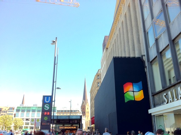 Als ich vorgestern an dem Gebäude direkt neben dem Alsterhaus vorbeilief, staunte ich nicht schlecht, da plötzlich ein großes, leuchtendes Windows-Logo auf dem Bausichtschutz prangte (siehe Twitpic).